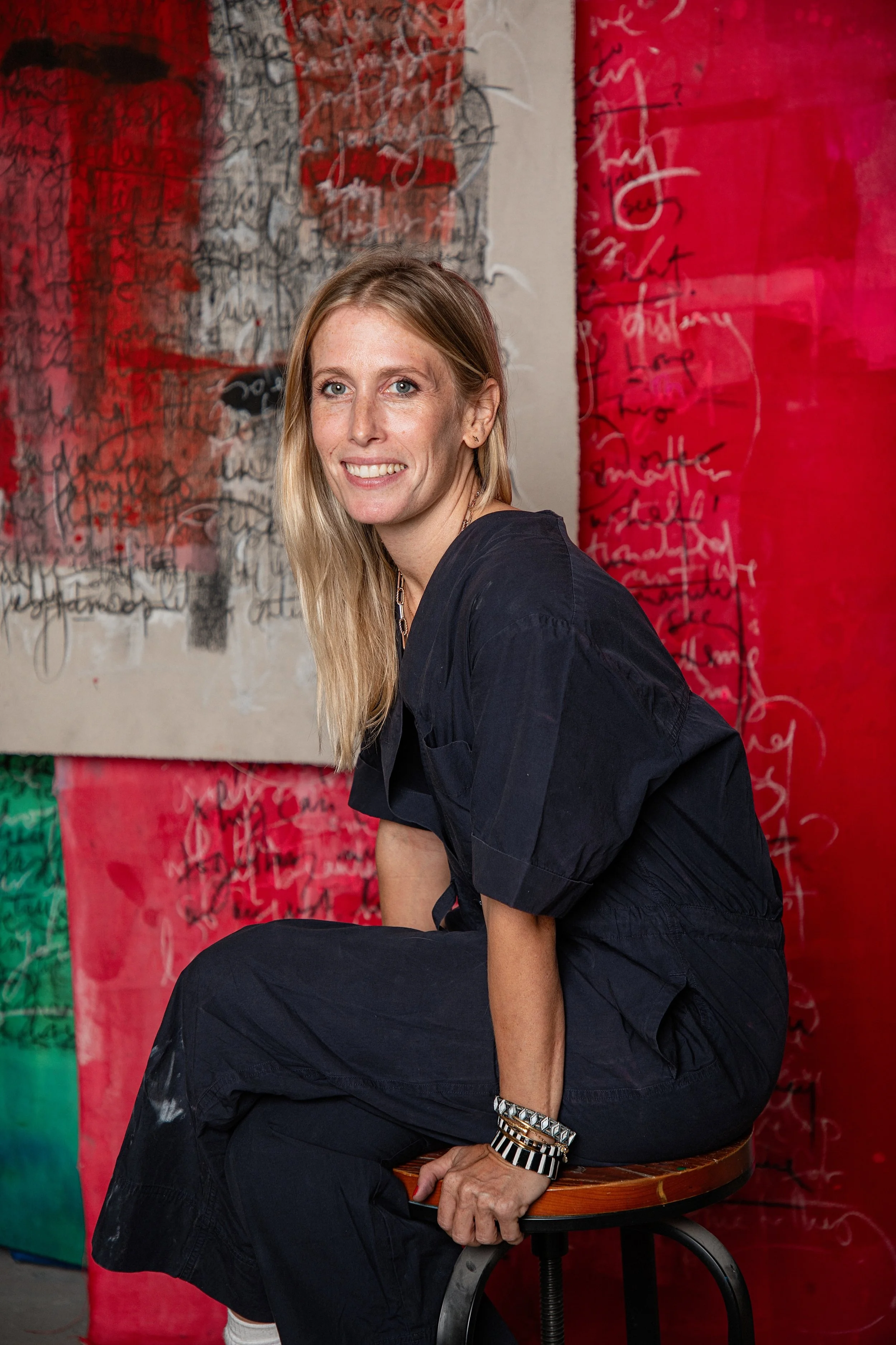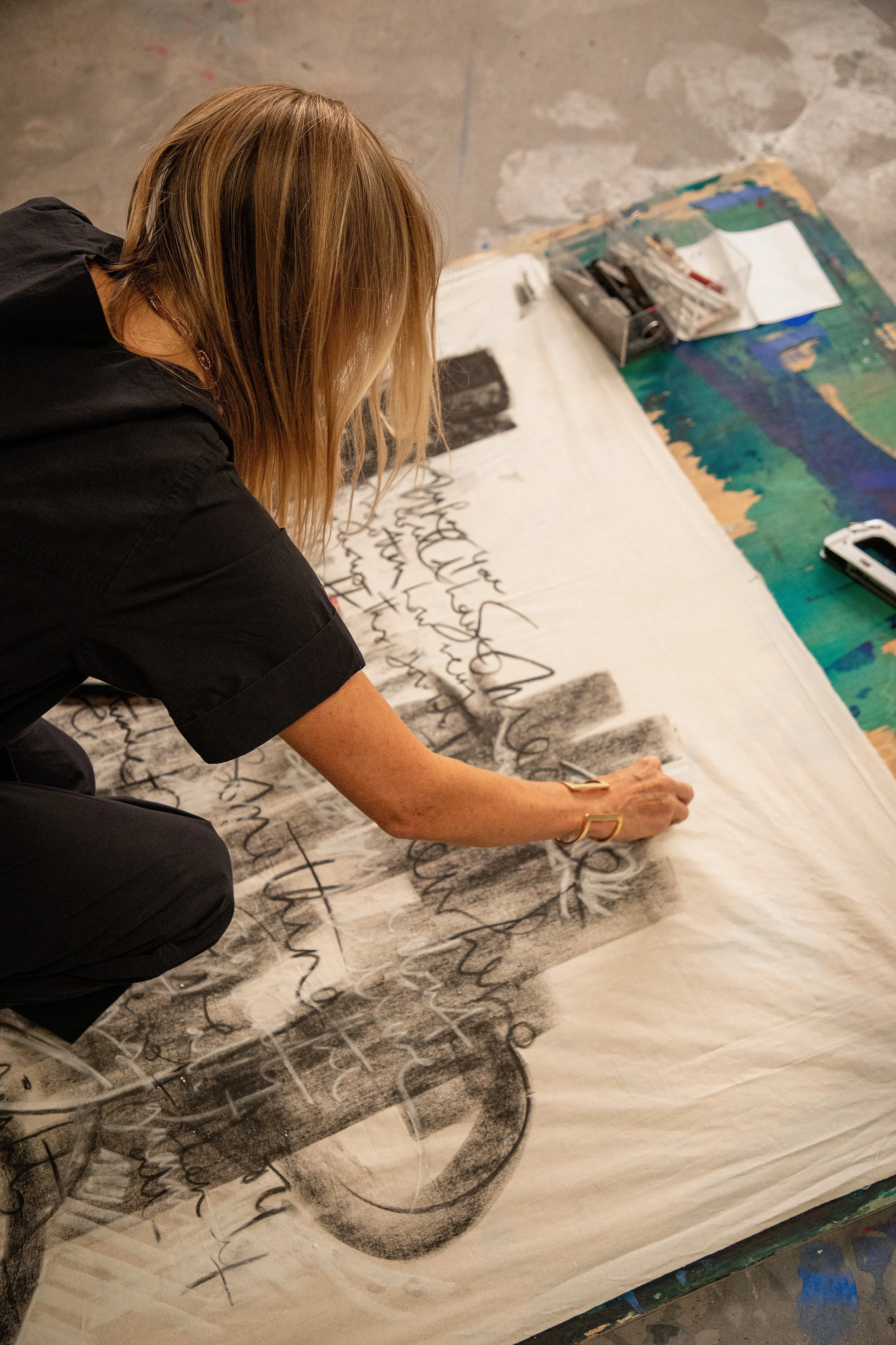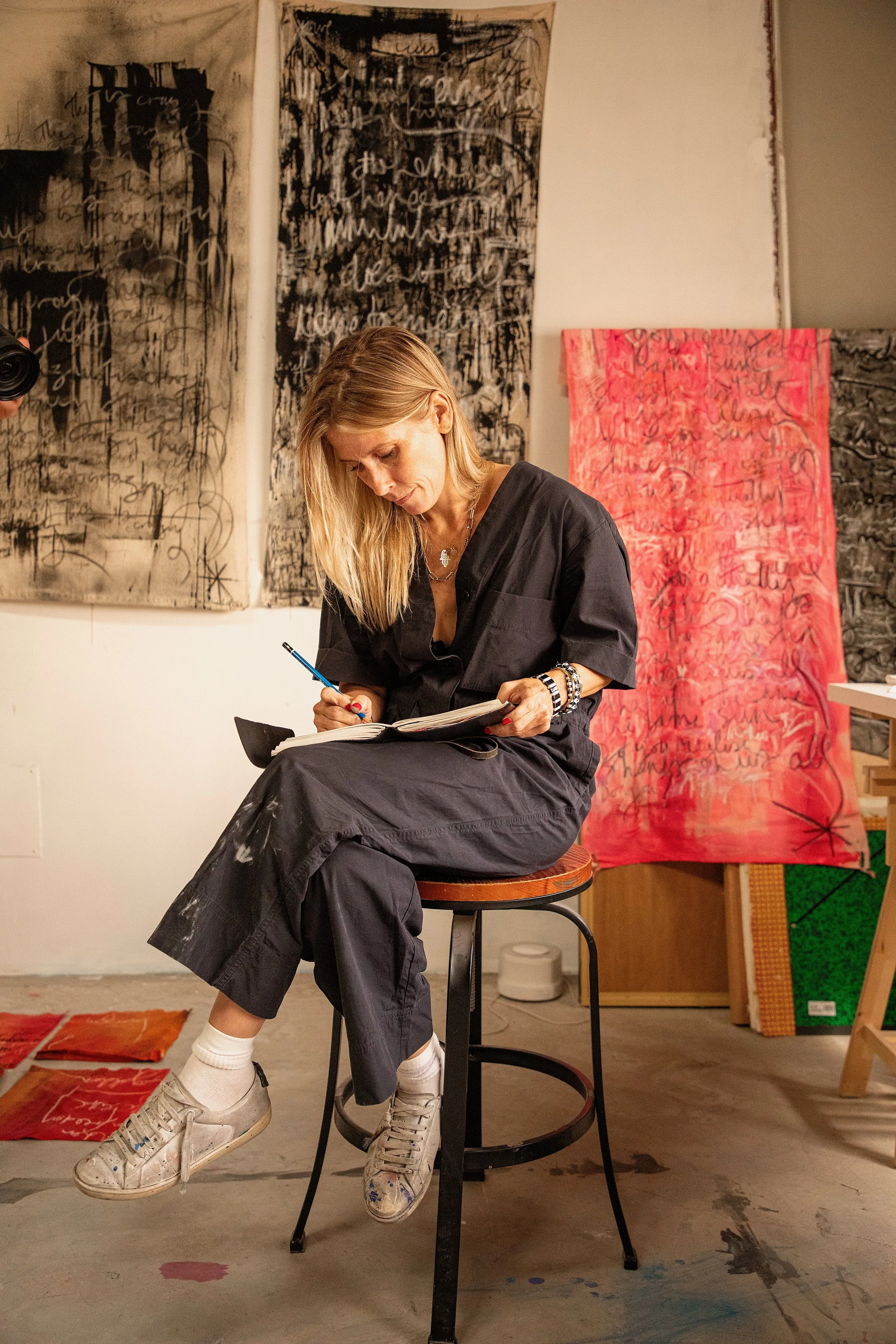 “I don’t consider myself a writer or a painter,” she says. “I use words the way other artists use strokes—purely to express emotion. I’m not interested in legibility. I’m interested in truth.”