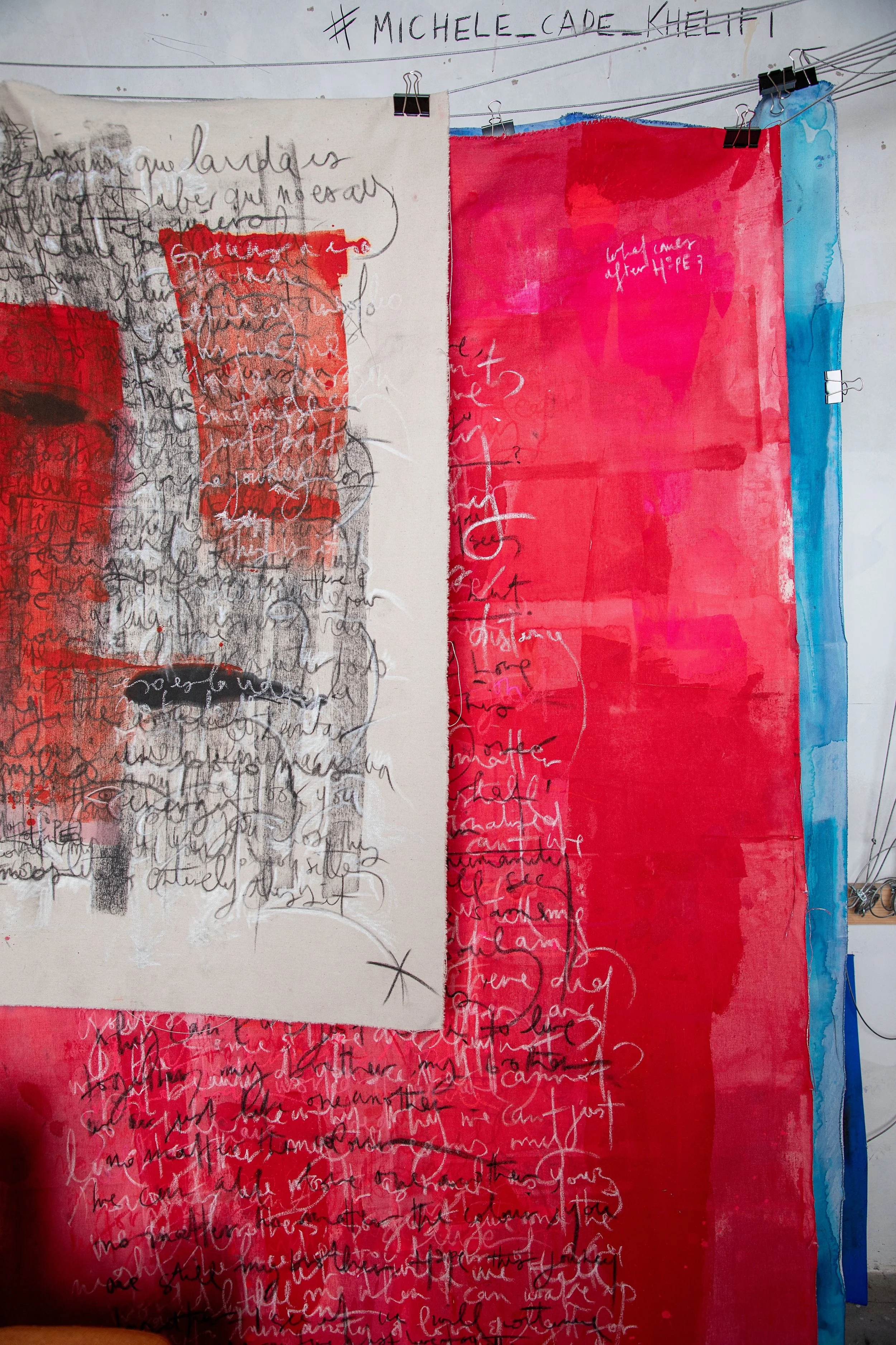 Born in 1980, Khelifi studied at Central Saint Martins before spending two decades in branding. But it wasn’t until living in Hong Kong—surrounded by the quiet force of Chinese calligraphy—that she returned to painting. What emerged was a practice that lives at the intersection of language and abstraction, writing and silence.