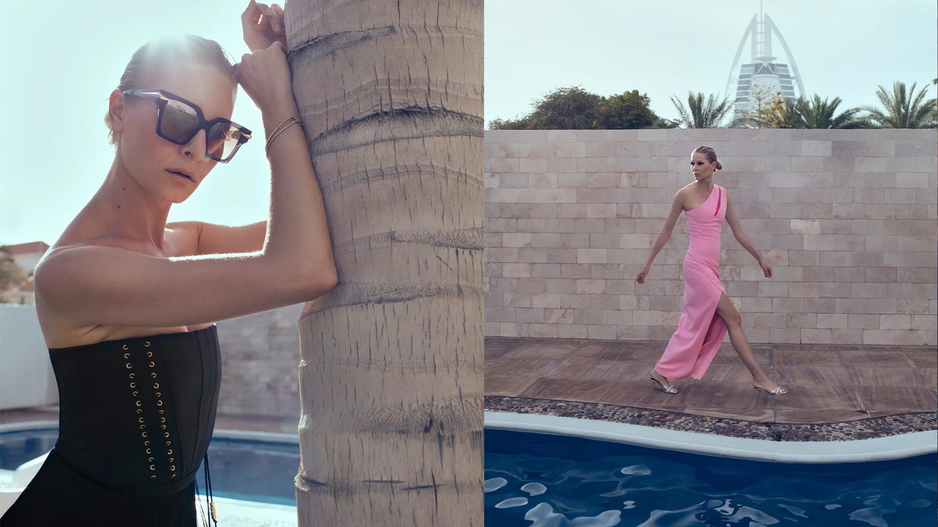 Ludmilla Voronkina Bozzetti wears Elisabetta Franchi and sunglasses by Roberto Cavalli (LEFT), Gown by Ganni and shoes by Malone Souliers (RIGHT). Photography by Ayaad Damouni, D&D Management. Hair and makeup by Vimi Joshi, D&D Management. Fashion Direction by Meredith Damouni, D&D Management.